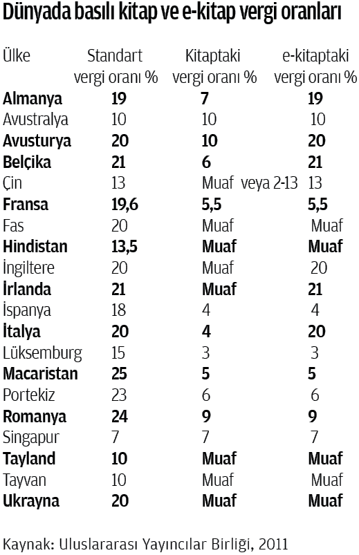Avrupa Komisyonu, geçtiğimiz ekim ayında dijital teknolojideki vergi oranlarında yeni bir düzenlemeye gideceğini duyurmuştu, çünkü Avrupa Birliği’ne üye kimi ülkeler teknoloji endüstrisini çekmek için vergi oranlarında indirime giderek haksız bir rekabet sağlıyor. Pek çok teknoloji devi de bu boşluğu fırsat bilerek o ülkeler üzerinden ticaretini sürdürüyor. Fransa, hem basılı kitaba hem de e-kitaba yüzde 5,5; Lüksemburg ise yüzde 3 oranında vergi uyguluyor. Özellikle bu iki ülke Amazon, Kobo ve Nook gibi e-kitap firmalarının merkezi konumuna dönüşüyor. İngiltere ve Almanya gibi ülkeler ise bu durumdan rahatsız. İngiltere’de basılı kitaplar (buna dergiler, gazeteler ve basılı yayımlar da dâhil) vergiden muafken, e-kitaptan yüzde 20 vergi alınıyor. Yayıncılık sektöründe büyük pay sahibi olan Almanya’da ise basılı kitapta yüzde 7, e-kitapta yüzde 21 oranında vergi uygulanıyor. Avrupa Birliği Komisyonu bu farklılıkları göz önünde bulundurarak e-kitaptaki vergi oranında standart bir indirim yapmaya veya vergileri tamamen kaldırmaya yönelik çeşitli taslaklar üzerinde çalışıyor. Avrupalı yayıncılar da birliğe üye ülkeler için ortak bir vergi politikası oluşturulmasından yana.
